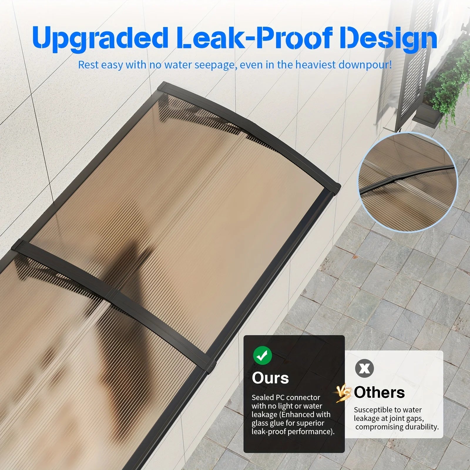 LEAK-PROOF DESIGN: This awning features an upgraded assembly design with tightly sealed PC joints. Each joint ensures sufficient sealing, preventing water from seeping through even during heavy rain. You can enjoy the rain scenery without getting wet. We suggest all connectors apply glass glue for a better leak-proof effect (glass glue not included).